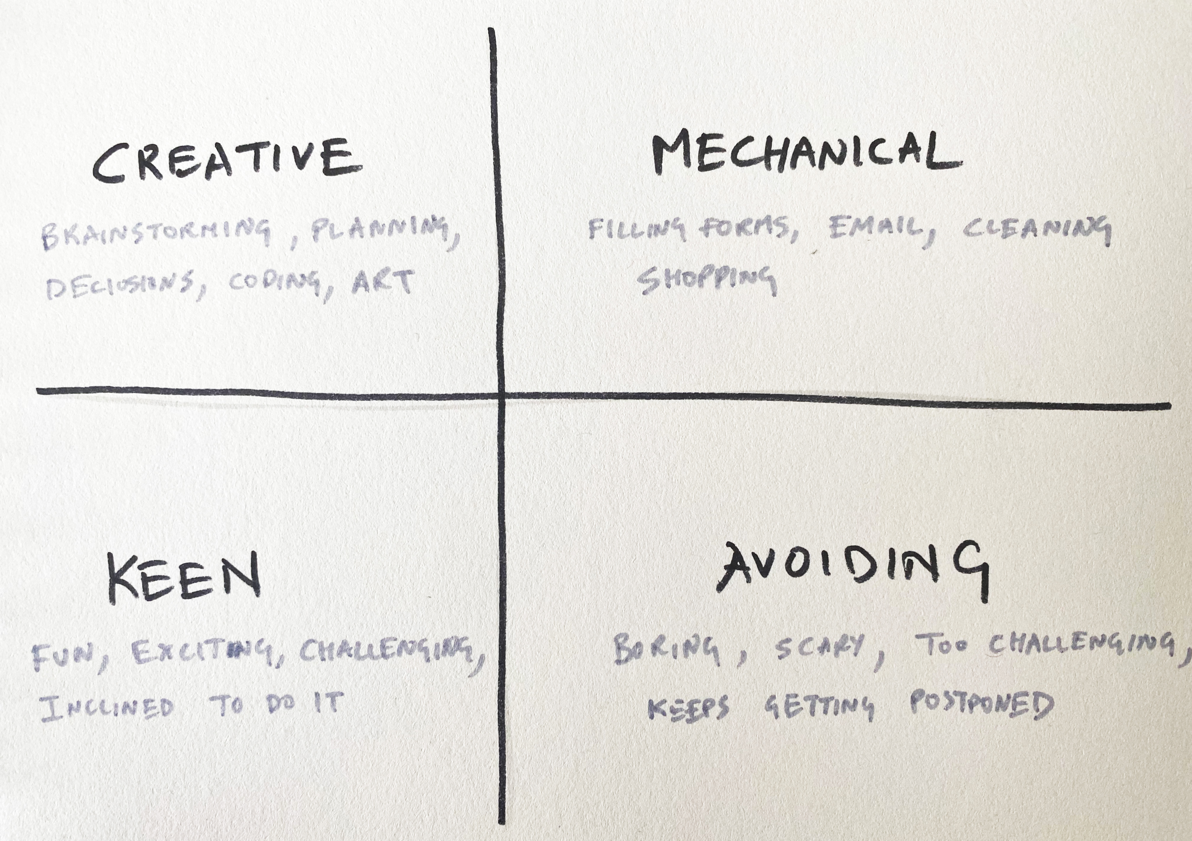 A task has another quality: you’re either keen on doing it (because maybe it’s fun, inspiring, or challenging), or you’re avoiding it for some reason (maybe it’s boring, scary, or overly challenging).