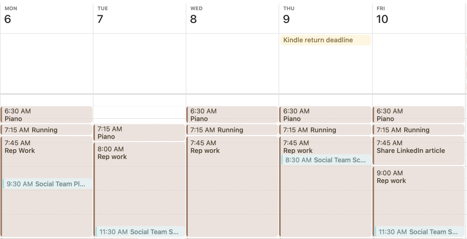 After reading a draft of this article, some coworkers said they work the opposite way. One of them, a product manager, said she likes replying to easy emails in the morning because the quick win propels her for more challenging work later, like writing requirements for large projects. It's an important point. While mornings are great for complex tasks, starting with a quick and easy win amps you up before you get to the hard things. We're going to zoom into this in another article, but if you look at my calendar above, it's another reason why I practice piano before starting my coding tasks. It gives me that quick win.